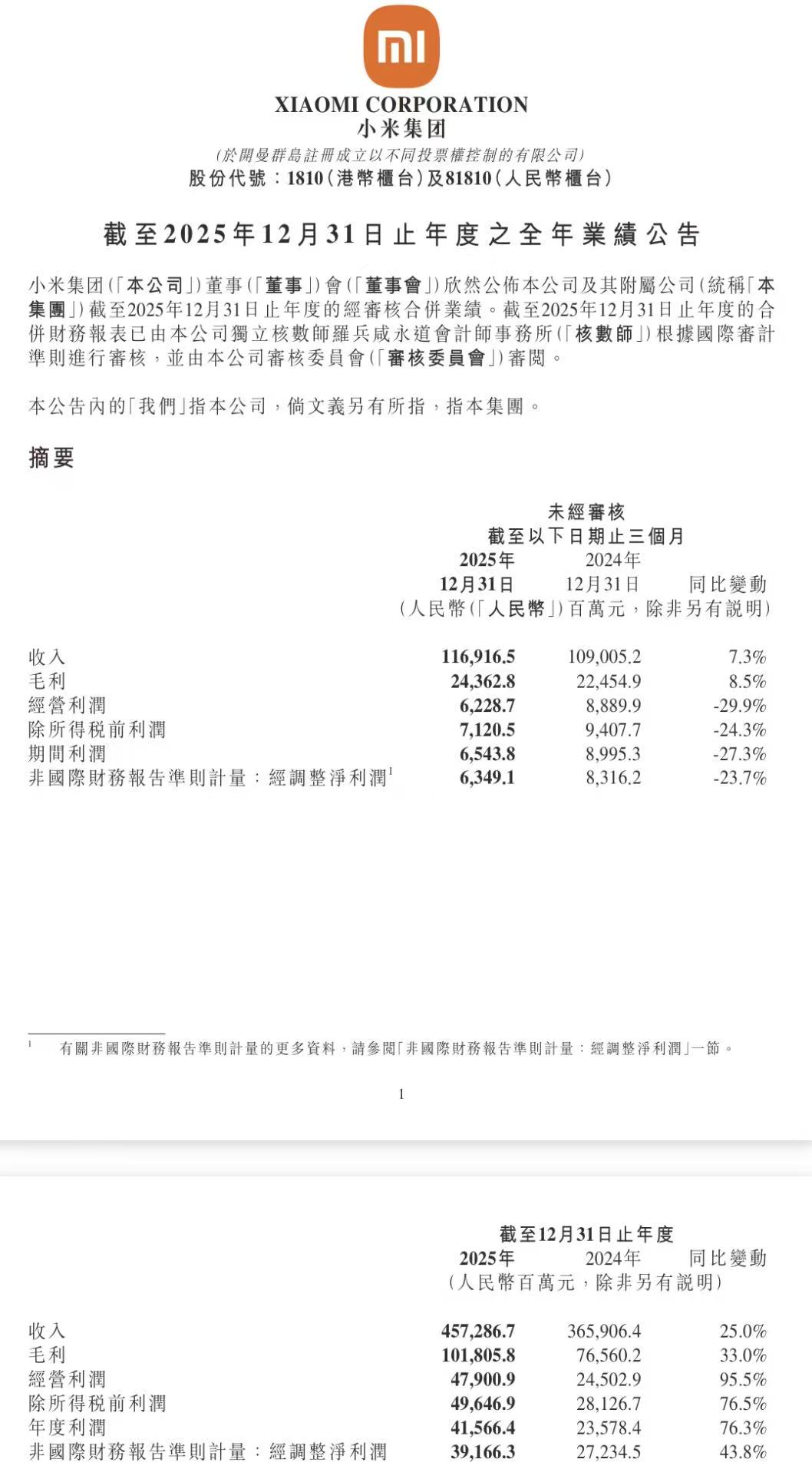 小米集团:2025年全年调整后净利润391.7亿元 比上年增长44%