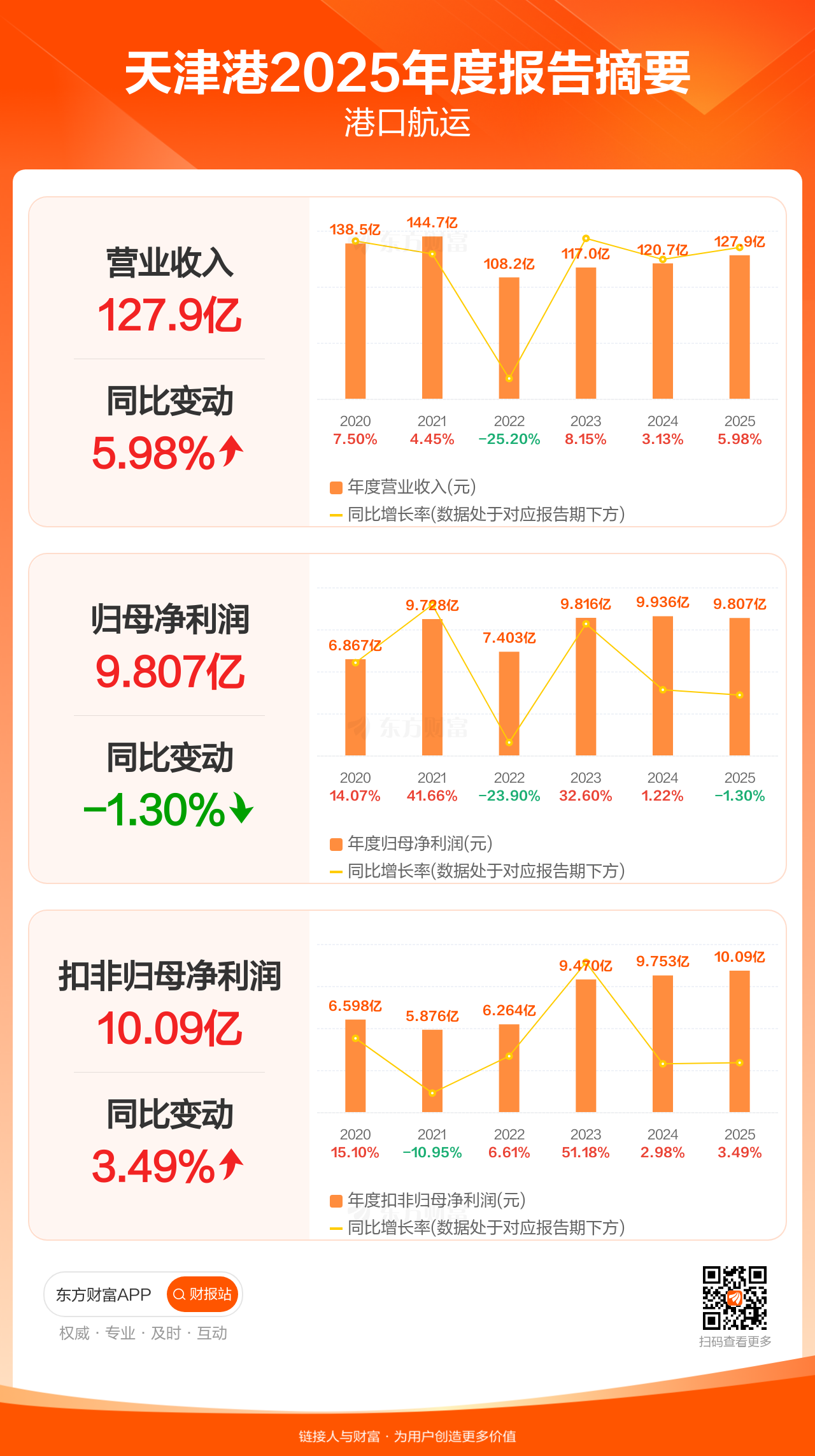 天津港3月25日发布2025年年报显示,公司全年实现营业收入127.92亿元,同比增长5.98%;归母净利润9.81亿元,同比下滑1.30%;扣非归母净利润10.09亿元,同比增长3.49%。
