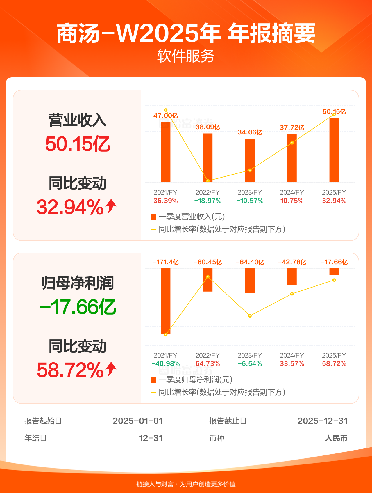 商汤-W3月24日发布年报业绩,截至2025年12月31日的12个月内,该公司营业收入50.15亿人民币,同比增长32.94%;公司权益持有人应占溢利(归母净利润)-17.66亿人民币,上年同期-42.78亿人民币,低于机构一致预测的-7.02亿人民币。