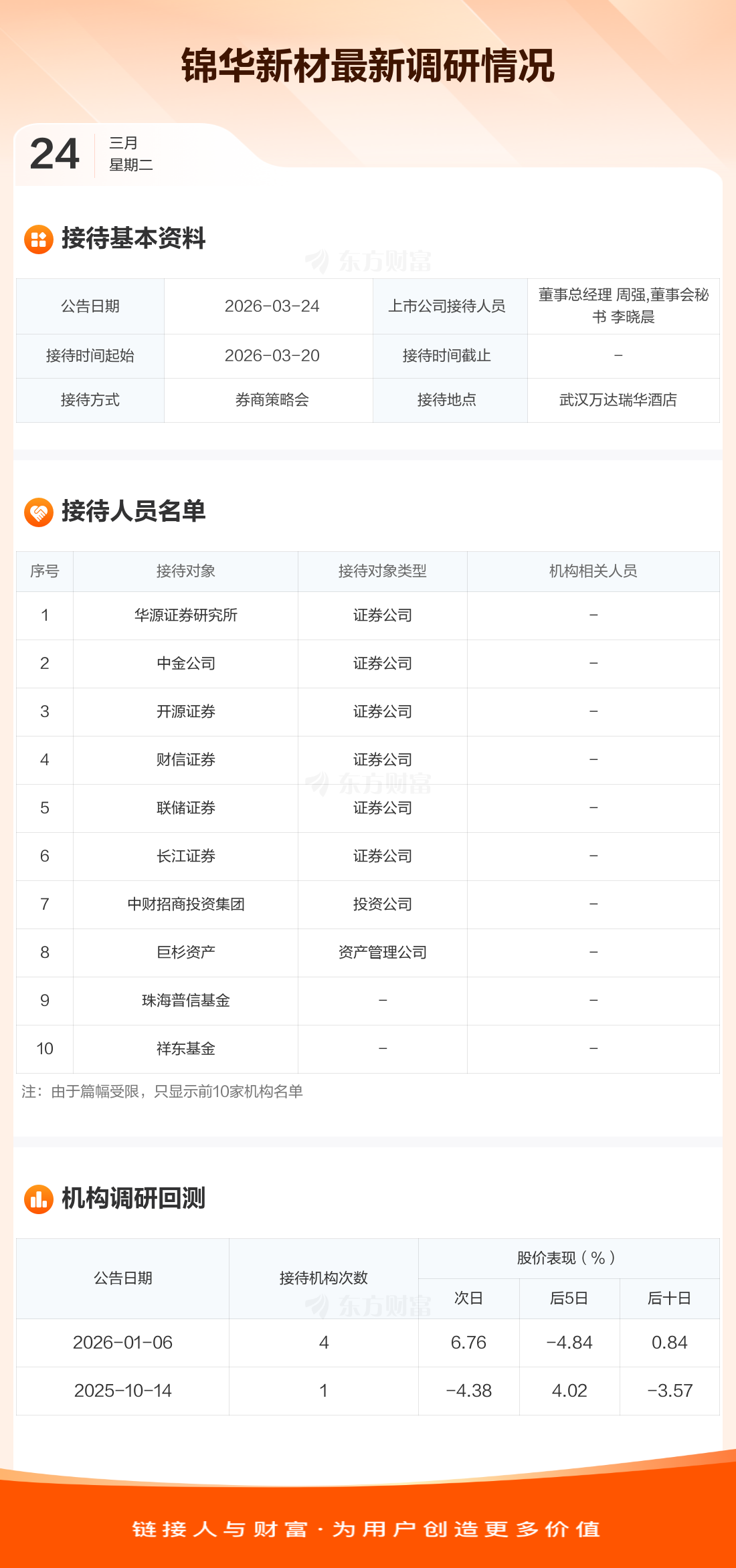 锦华新材3月24日公告称,3月20日接待华源证券研究所等24家机构调研。接待人员包括董事总经理 周强,董事会秘书 李晓晨。