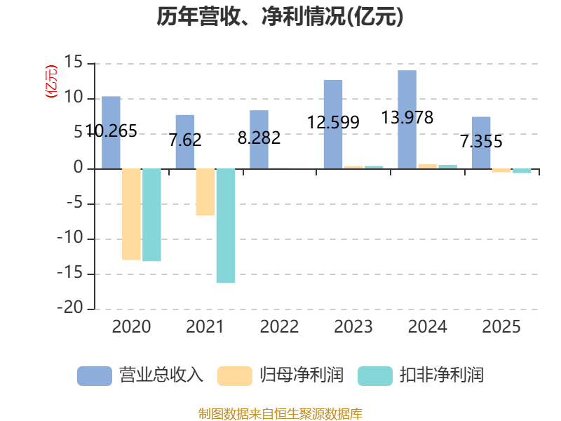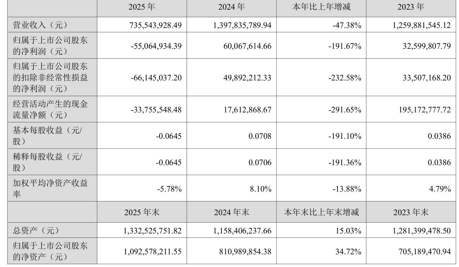 中证智能财讯索菱股份(002766)3月24日披露2025年年度报告。2025年,公司实现营业总收入7.36亿元,同比下降47.38%;归母净利润亏损5506.49万元,上年同期盈利6006.76万元;扣非净利润亏损6614.5万元,上年同期盈利4989.22万元;经营活动产生的现金流量净额为-3375.55万元,上年同期为1761.29万元;报告期内,索菱股份基本每股收益为-0.0645元,加权平均净资产收益率为-5.78%。