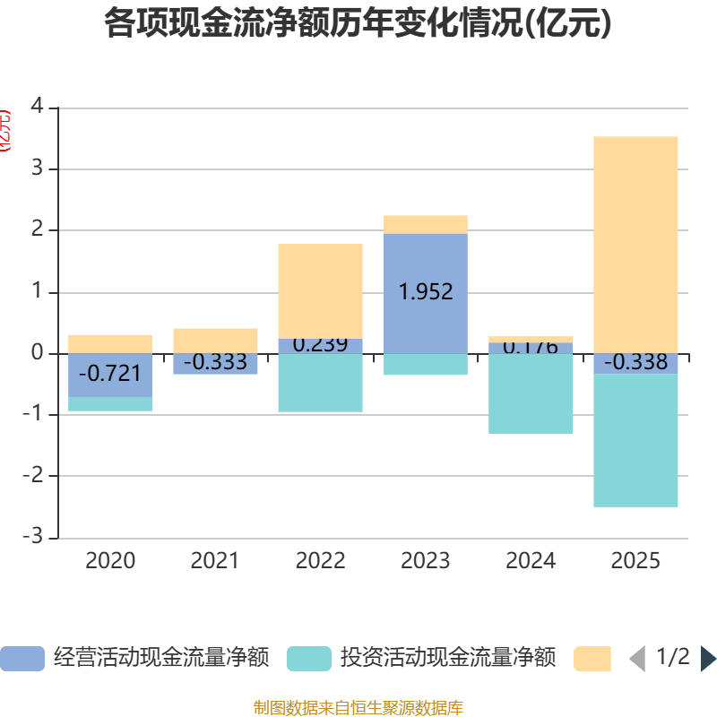截至2025年,公司经营活动现金流净额为-3375.55万元,同比减少5136.84万元;筹资活动现金流净额3.53亿元,同比增加3.42亿元;投资活动现金流净额-2.16亿元,上年同期为-1.31亿元。