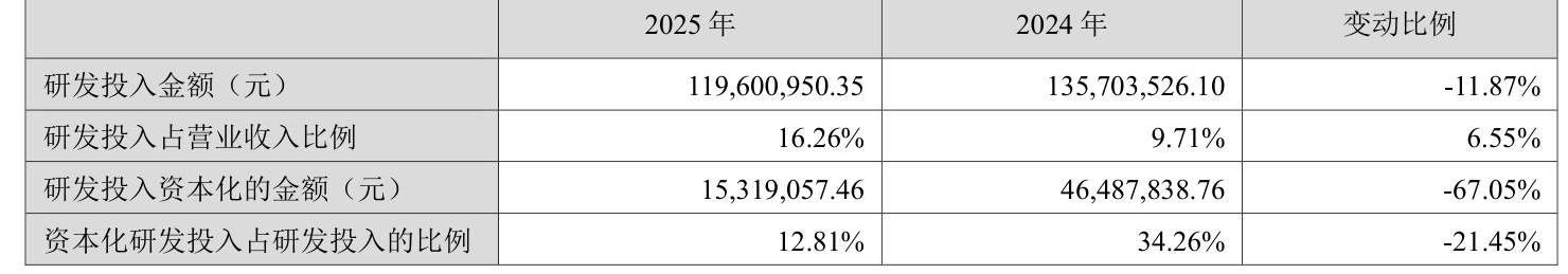 2025年全年,公司研发投入金额为1.2亿元,同比下降11.87%;研发投入占营业收入比例为16.26%,相比上年同期上升6.55个百分点。此外,公司全年研发投入资本化率为12.81%。