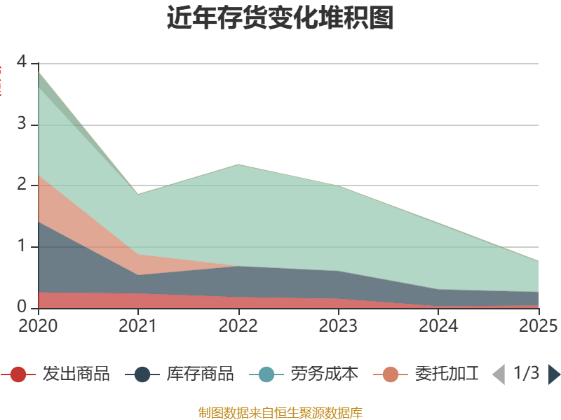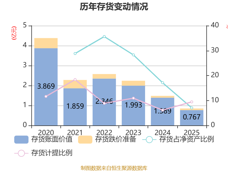 从存货变动来看,截至2025年末,公司存货账面价值为7671.66万元,占净资产的7.02%,较上年末减少6216.87万元。其中,存货跌价准备为799.06万元,计提比例为9.43%。
