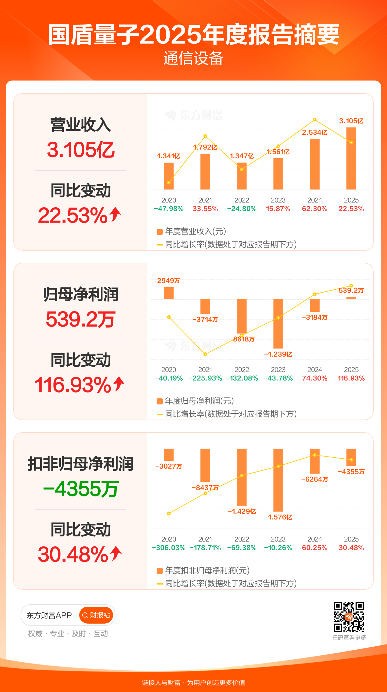 国盾量子3月25日发布2025年年报显示,公司全年实现营业收入3.10亿元,同比增长22.53%;归母净利润539.19万元,同比增长116.93%;扣非归母净利润-4354.97万元。每股EPS0.05元,低于机构一致预测的0.26元。