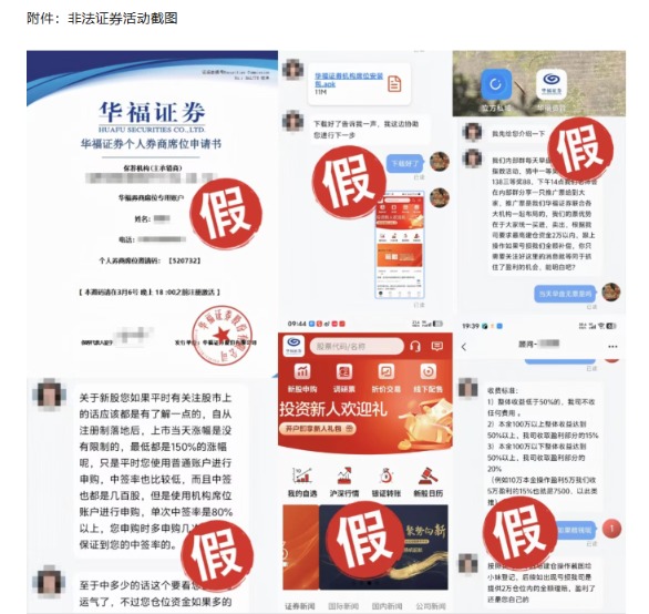 上述不法分子谎称可提供调研、精选股票,开通所谓的“券商机构席位账户”后,按指令操作后提供建仓明细,亏损可赔付。更夸张的是,不法分子宣称用该账户申购新股中签率可高达80%以上。随后,他们诱导投资者通过二维码下载“华福资管”“华福智投”等仿冒App,虚构交易收益,甚至伪造了公司营业执照、公章、协议合同及员工签名,出具了《华福证券个人券商席位申请书》等虚假文件。