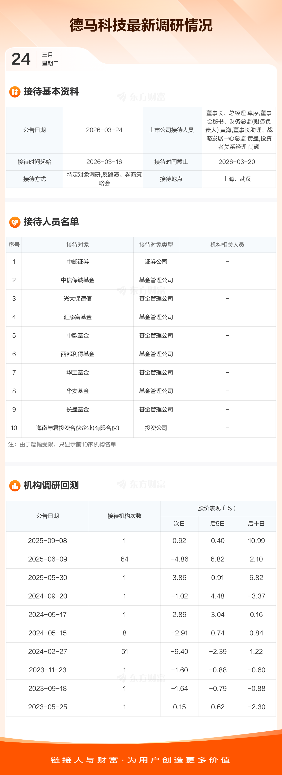 德马科技3月24日公告称,3月16日至3月20日接待中邮证券等24家机构调研。接待人员包括董事长、总经理 卓序,董事会秘书、财务总监(财务负责人) 黄海,董事长助理、战略发展中心总监 黄盛,投资者关系经理 尚硕。