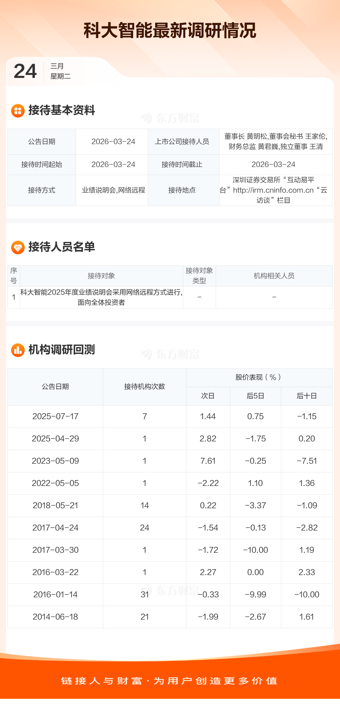 科大智能3月24日公告称,3月24日接待科大智能2025年度业绩说明会采用网络远程方式进行,面向全体投资者等1家机构调研。接待人员包括董事长 黄明松,董事会秘书 王家伦,财务总监 黄君巍,独立董事 王清。