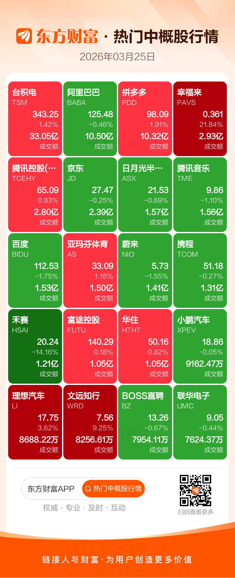 台积电涨1.42%,阿里巴巴跌0.46%,拼多多涨1.91%,幸福来涨21.84%,腾讯控股(ADR)涨0.83%,京东跌0.25%,日月光半导体跌0.69%,腾讯音乐跌1.10%,百度跌1.75%,亚玛芬体育涨1.16%。