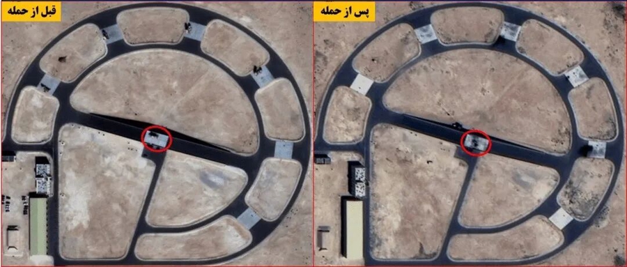 袭击前(左)和袭击后的卫星对比图。(图片来源:伊朗法尔斯通讯社)