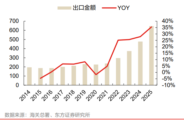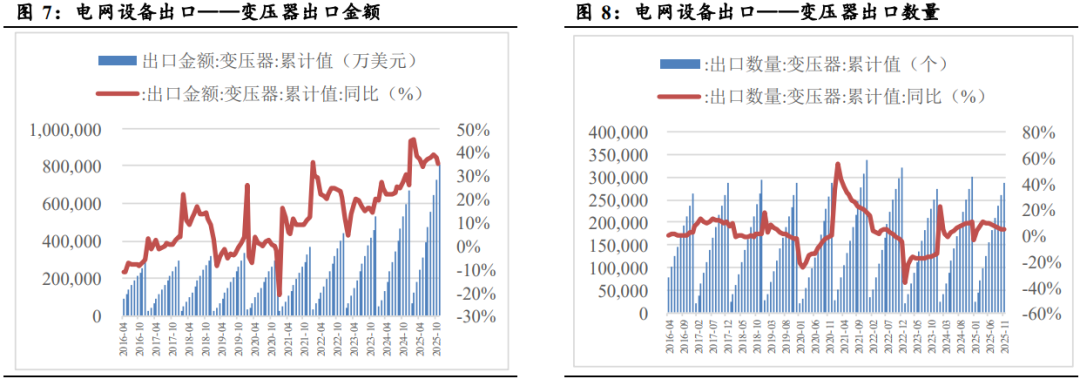 2025年主要电力设备出口总额同比增长24%,其中变压器出口金额同比增长35%,全年及单12月出口额均创历史新高,中东、美洲、东南亚、欧洲区域增速均表现亮眼。我们持续看好全球迎来电力投资大周期,中国企业海外布局加码,盈利弹性有望释放。