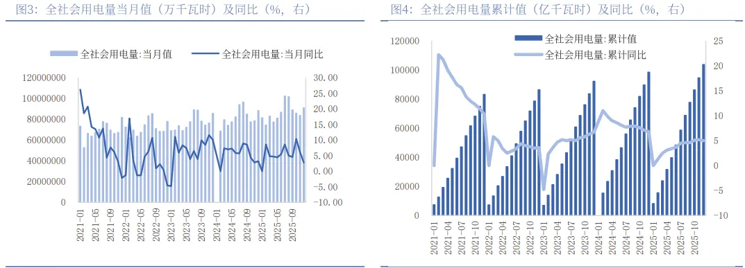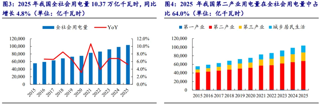 2025年,电力需求维持平稳增长,我国全社会用电10.37万亿千瓦时,同比增长5.0%。预计十五五期间我国将呈现“宽电量、紧电力”的电力供需格局,综合电价有望企稳。