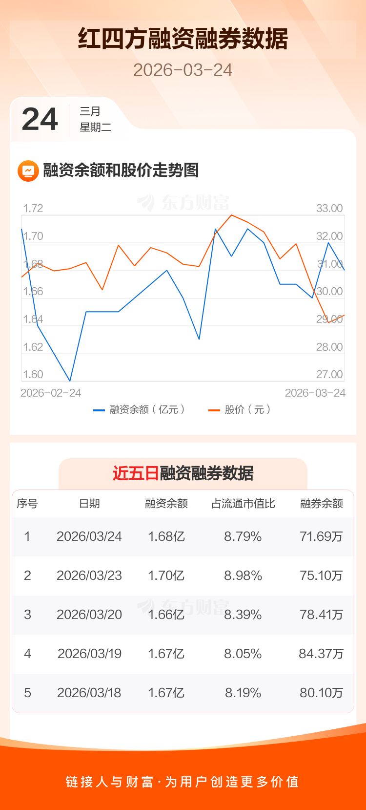 交易所最新数据显示,红四方于2026年3月24日获融资买入648.47万元,融资偿还852.82万元,当日融资净偿还204.36万元。目前,该股融资余额1.68亿,占流通市值比例为8.79%。