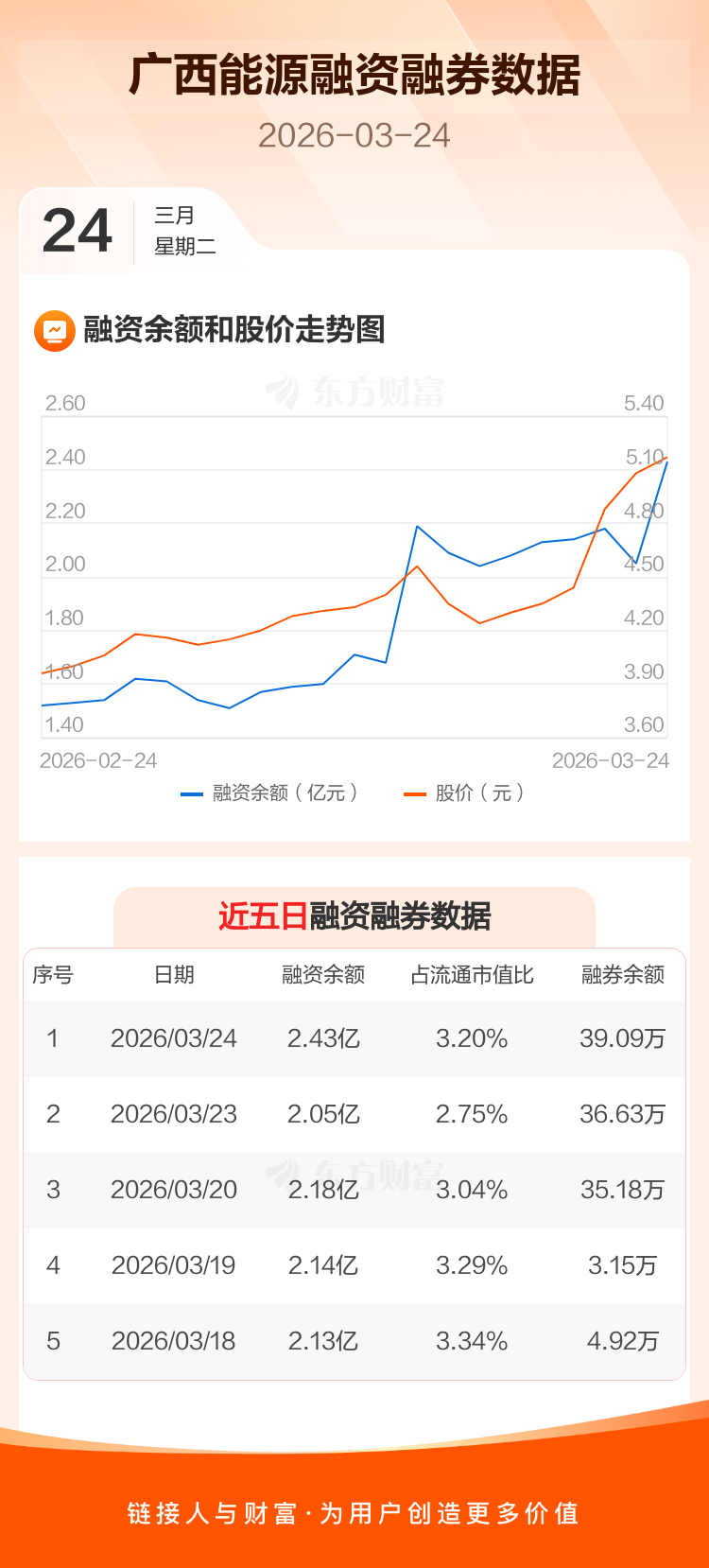 交易所最新数据显示,广西能源于2026年3月24日获融资买入1.02亿元,融资偿还6330.52万元,当日融资净买入3821.73万元。目前,该股融资余额2.43亿,占流通市值比例为3.20%。
