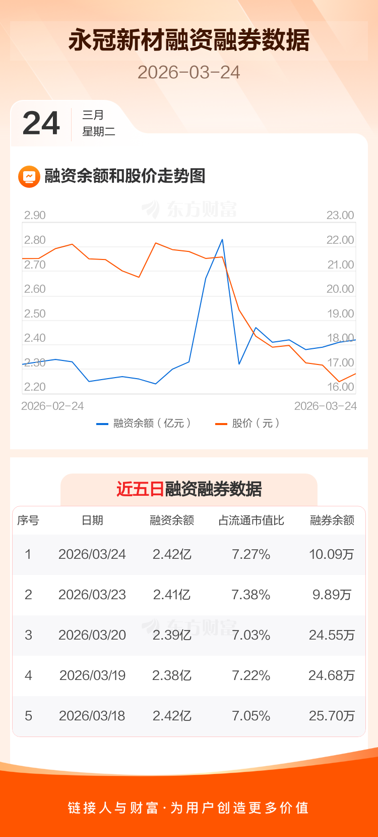 交易所最新数据显示,永冠新材于2026年3月24日获融资买入1106.80万元,融资偿还1008.91万元,当日融资净买入97.89万元。目前,该股融资余额2.42亿,占流通市值比例为7.27%。