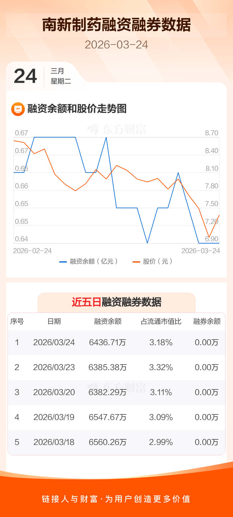 交易所最新数据显示,南新制药于2026年3月24日获融资买入179.82万元,融资偿还128.49万元,当日融资净买入51.33万元。目前,该股融资余额6436.71万,占流通市值比例为3.18%。