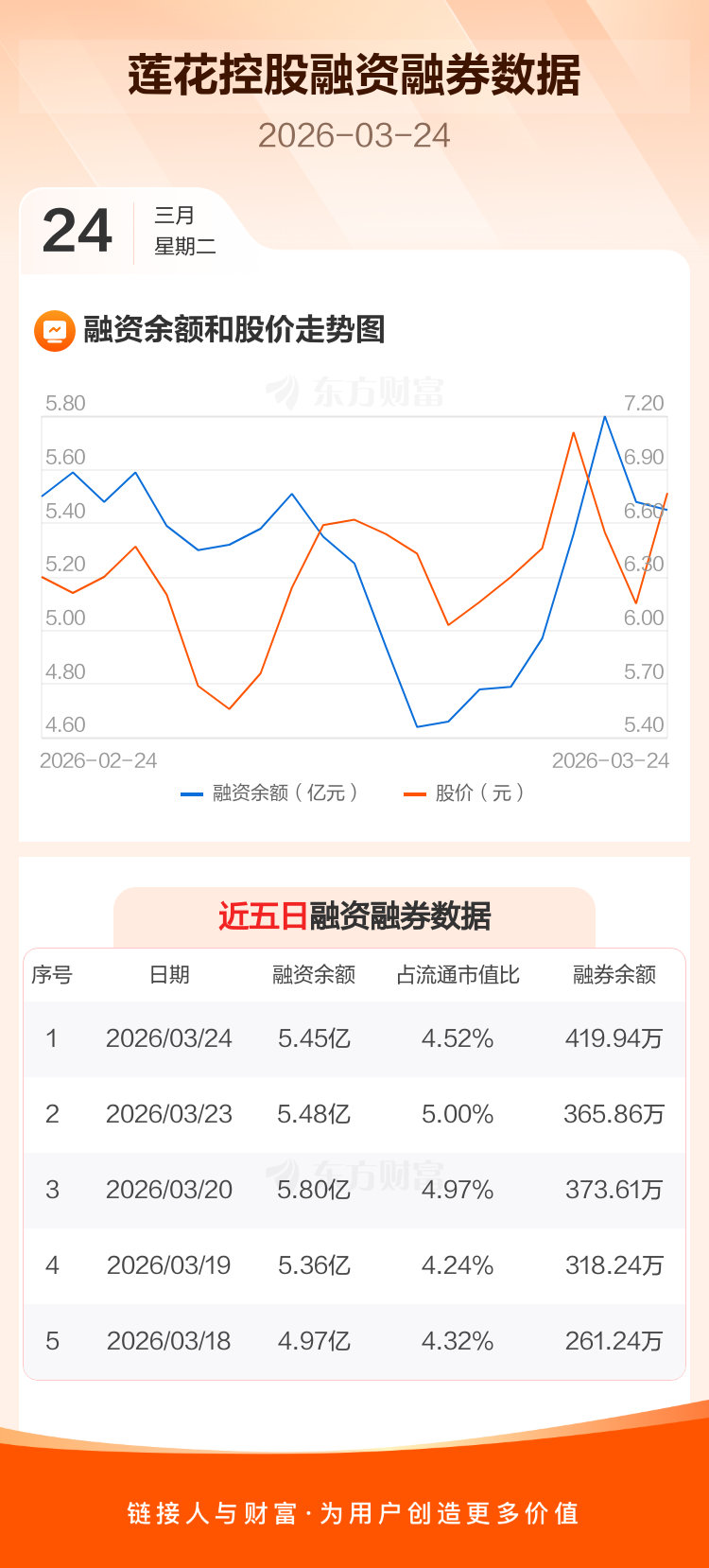 交易所最新数据显示,莲花控股于2026年3月24日获融资买入1.51亿元,融资偿还1.54亿元,当日融资净偿还334.85万元。目前,该股融资余额5.45亿,占流通市值比例为4.52%。