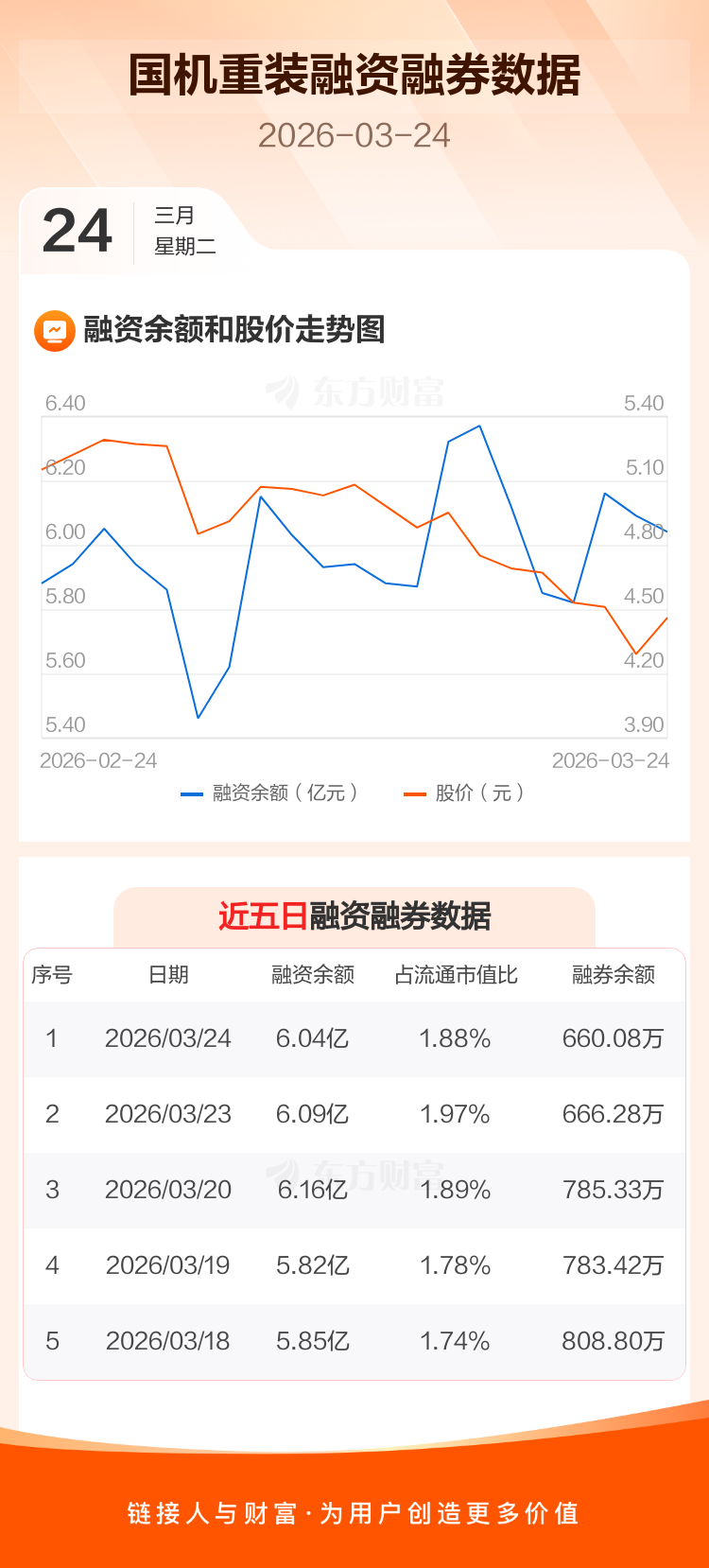 交易所最新数据显示,国机重装于2026年3月24日获融资买入2378.31万元,融资偿还2944.53万元,当日融资净偿还566.22万元。目前,该股融资余额6.04亿,占流通市值比例为1.88%。