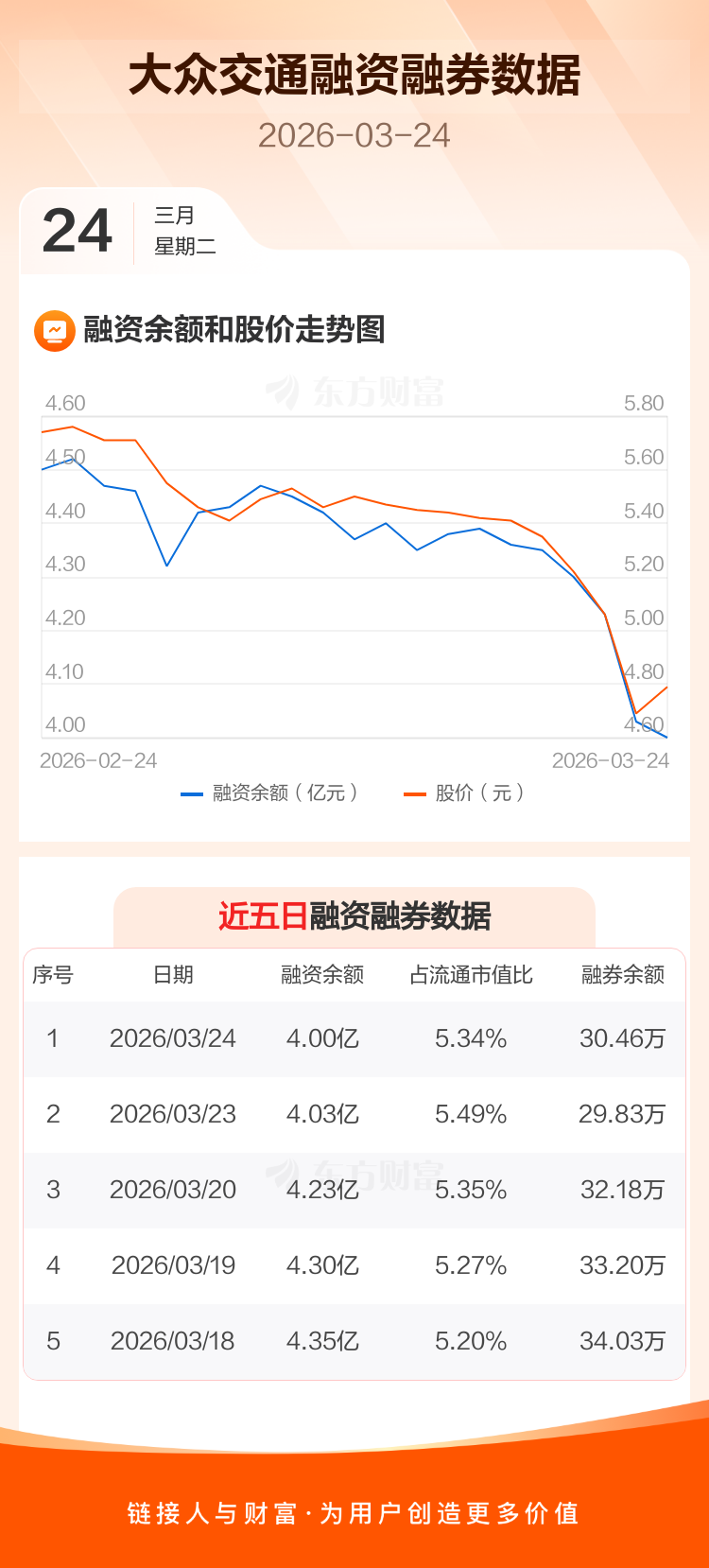 交易所最新数据显示,大众交通于2026年3月24日获融资买入633.84万元,融资偿还888.57万元,当日融资净偿还254.73万元。目前,该股融资余额4.00亿,占流通市值比例为5.34%。
