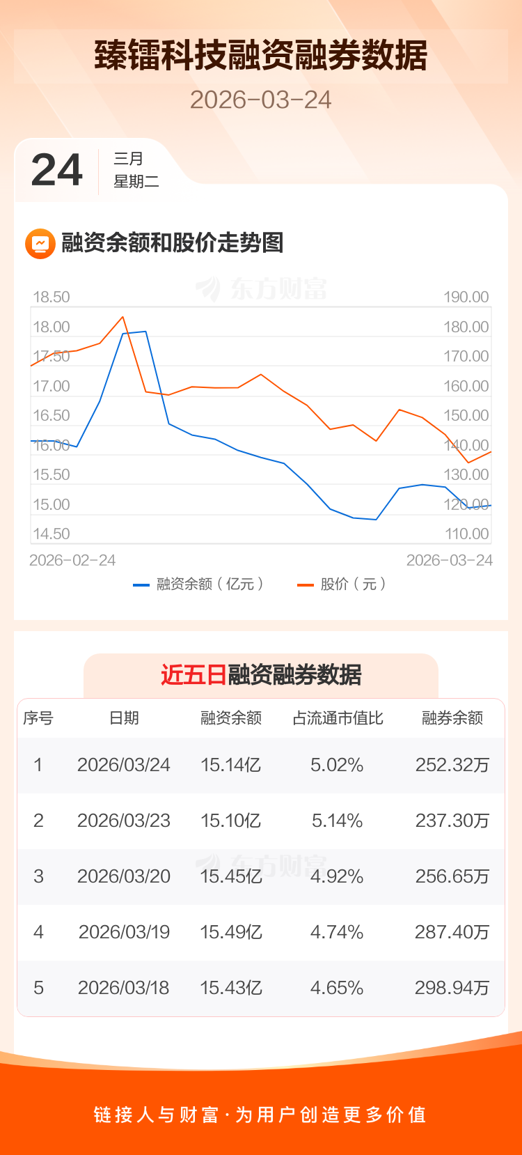 交易所最新数据显示,臻镭科技于2026年3月24日获融资买入8742.45万元,融资偿还8355.00万元,当日融资净买入387.45万元。目前,该股融资余额15.14亿,占流通市值比例为5.02%。