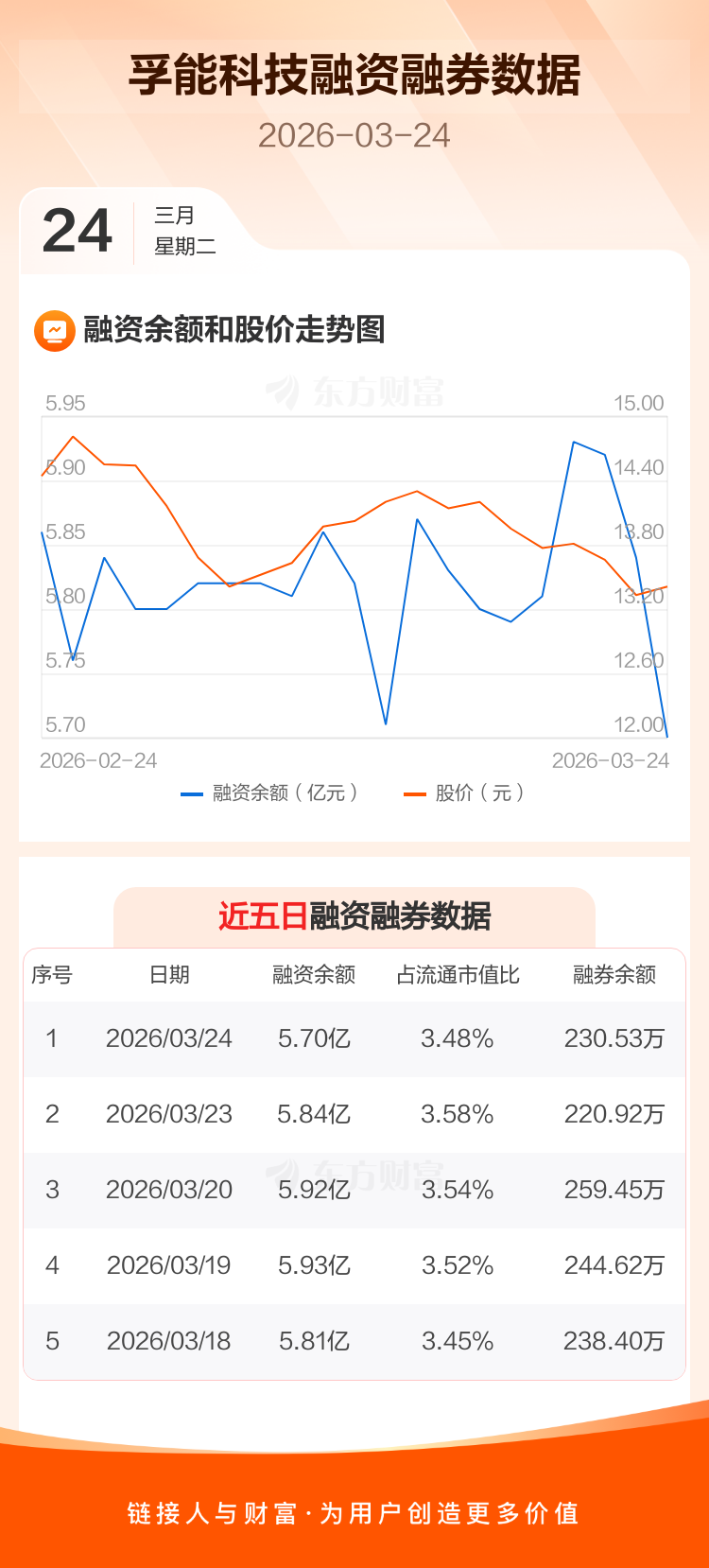 交易所最新数据显示,孚能科技于2026年3月24日获融资买入1193.98万元,融资偿还2557.31万元,当日融资净偿还1363.32万元。目前,该股融资余额5.70亿,占流通市值比例为3.48%。