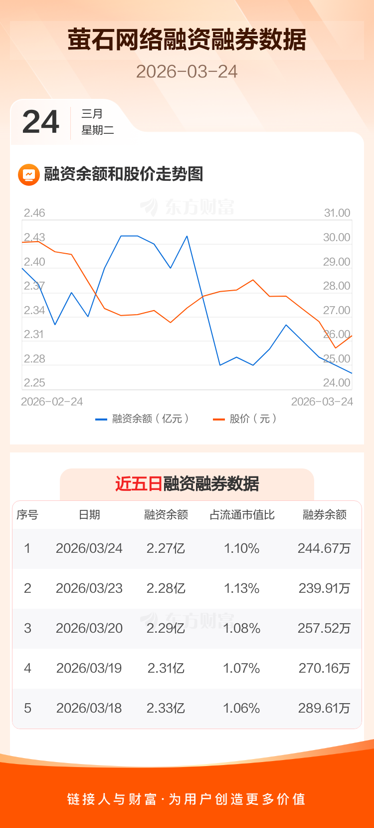 交易所最新数据显示,萤石网络于2026年3月24日获融资买入421.51万元,融资偿还535.48万元,当日融资净偿还113.97万元。目前,该股融资余额2.27亿,占流通市值比例为1.10%。