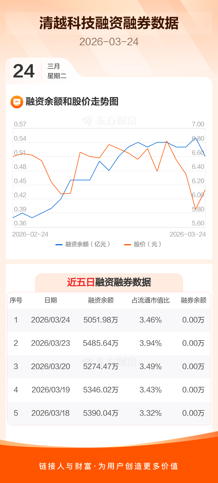 交易所最新数据显示,清越科技于2026年3月24日获融资买入371.82万元,融资偿还805.49万元,当日融资净偿还433.66万元。目前,该股融资余额5051.98万,占流通市值比例为3.46%。