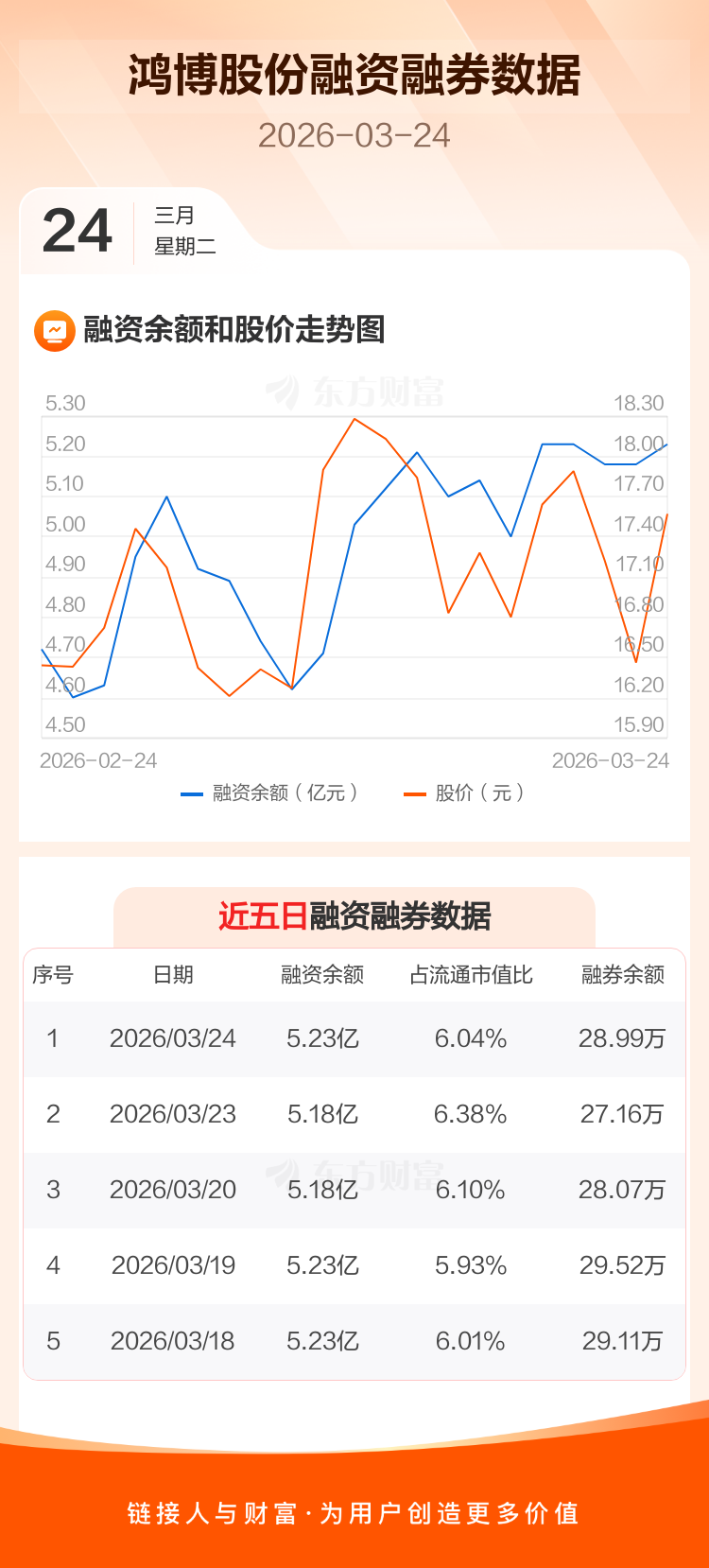 交易所最新数据显示,鸿博股份于2026年3月24日获融资买入8246.80万元,融资偿还7737.32万元,当日融资净买入509.49万元。目前,该股融资余额5.23亿,占流通市值比例为6.04%。