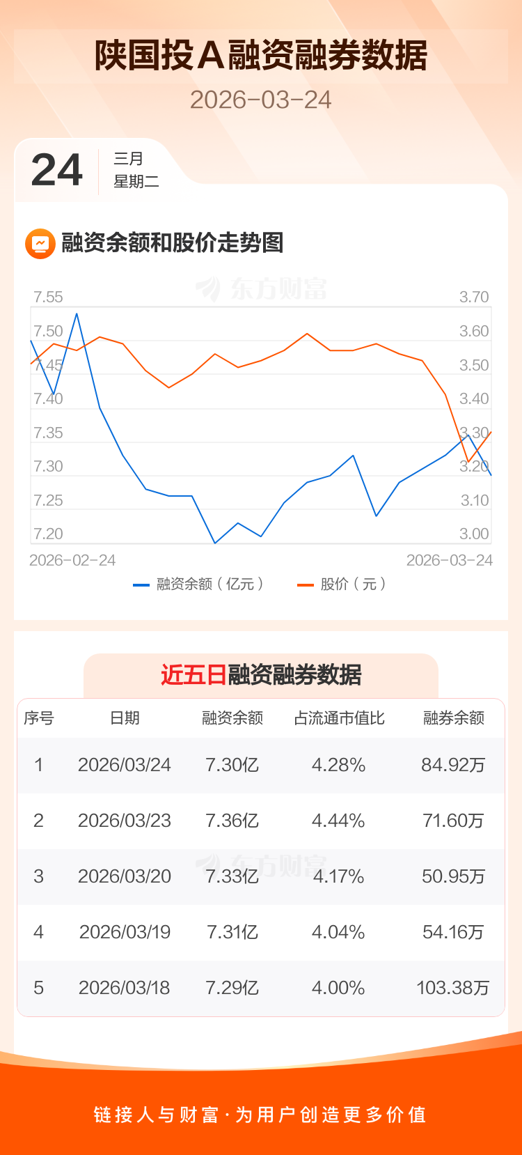 交易所最新数据显示,陕国投A于2026年3月24日获融资买入1733.08万元,融资偿还2381.82万元,当日融资净偿还648.74万元。目前,该股融资余额7.30亿,占流通市值比例为4.28%。