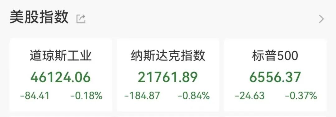 当地时间3月24日,美股三大指数重拾跌势。截至收盘,标普500指数跌0.37%,报6556.37点;纳斯达克综合指数跌0.84%,报21761.89点;道琼斯工业平均指数跌0.18%,报461124.06点。