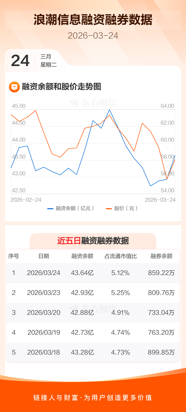 交易所最新数据显示,浪潮信息于2026年3月24日获融资买入2.75亿元,融资偿还2.04亿元,当日融资净买入7108万元。目前,该股融资余额43.64亿,占流通市值比例为5.12%。