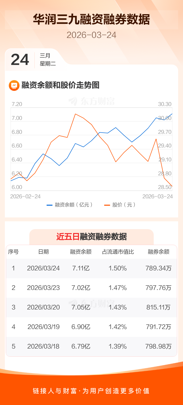 交易所最新数据显示,华润三九于2026年3月24日获融资买入2496.95万元,融资偿还1594.55万元,当日融资净买入902.4万元。目前,该股融资余额7.11亿,占流通市值比例为1.50%。