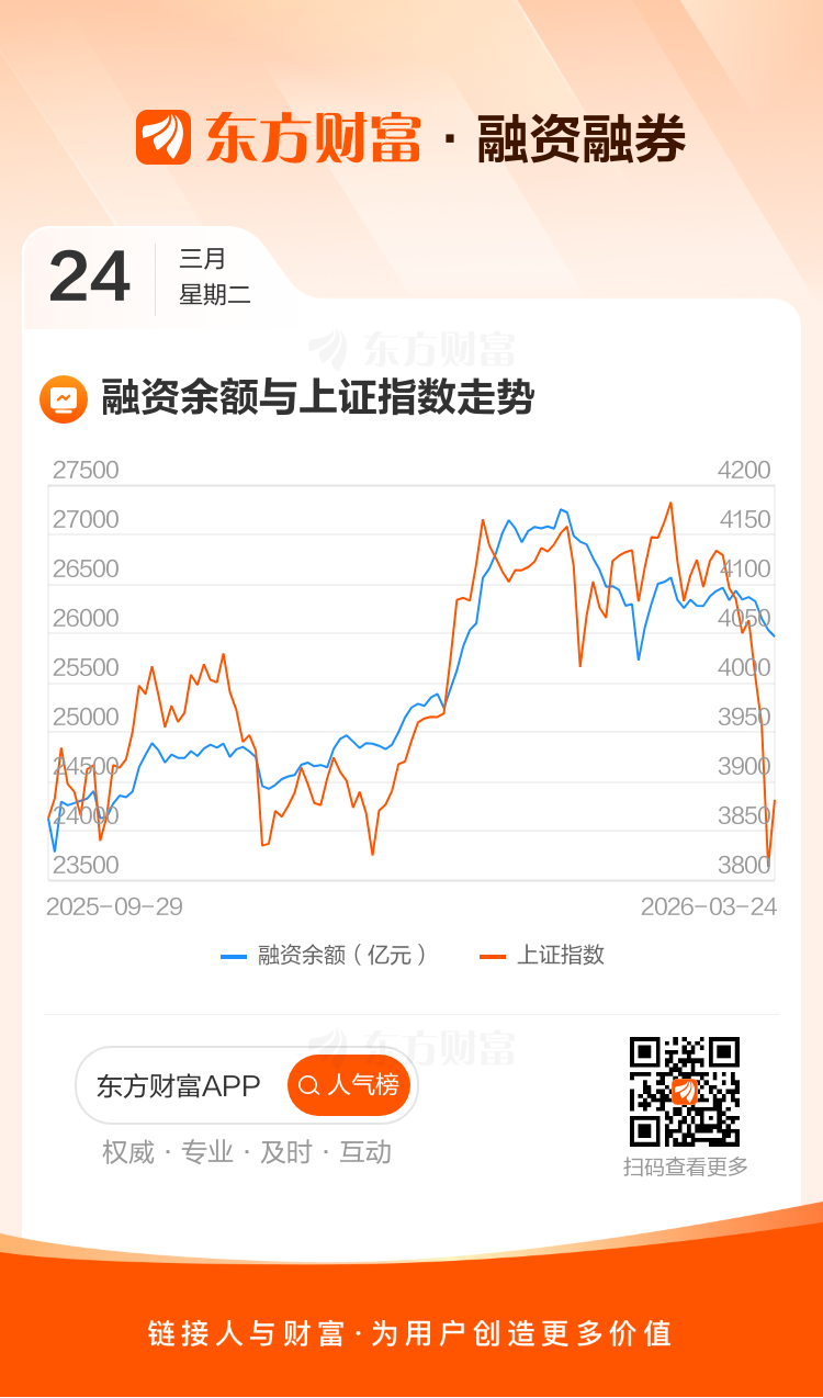 03月24日A股三大指数集体收涨,杠杆资金呈净卖出之势,当天融资余额2.60万亿,较上一交易日减少68.97亿。