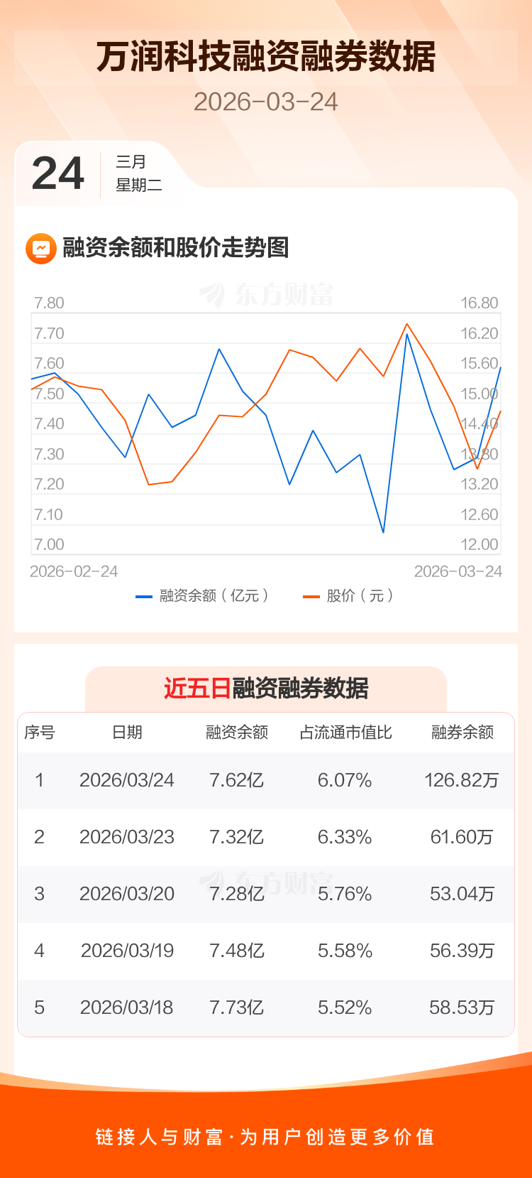 交易所最新数据显示,万润科技于2026年3月24日获融资买入1.38亿元,融资偿还1.08亿元,当日融资净买入3002.33万元。目前,该股融资余额7.62亿,占流通市值比例为6.07%。