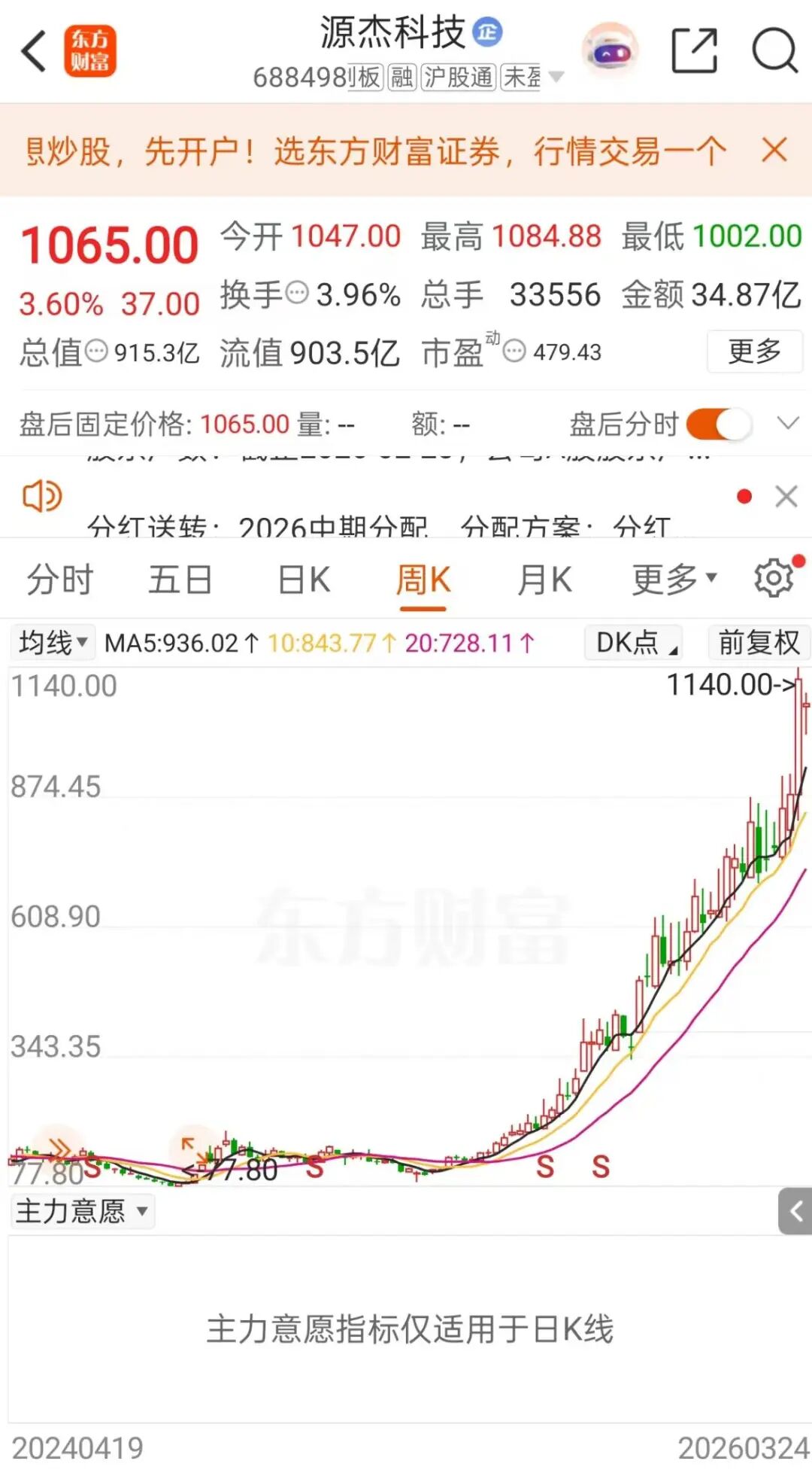 截至3月24日收盘,源杰科技报1065元/股,上涨3.60%,总市值达915亿元。