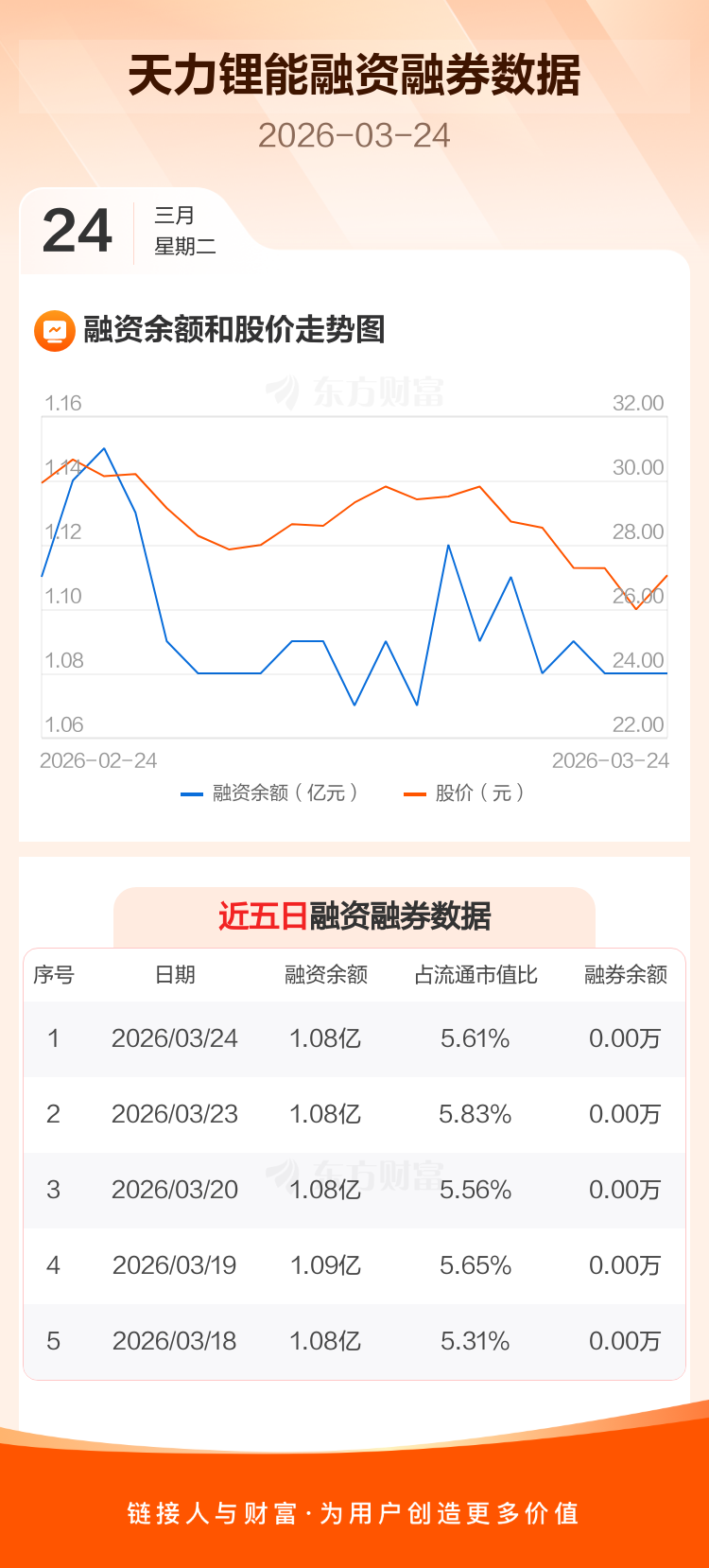 交易所最新数据显示,天力锂能于2026年3月24日获融资买入711.89万元,融资偿还693.60万元,当日融资净买入18.29万元。目前,该股融资余额1.08亿,占流通市值比例为5.61%。