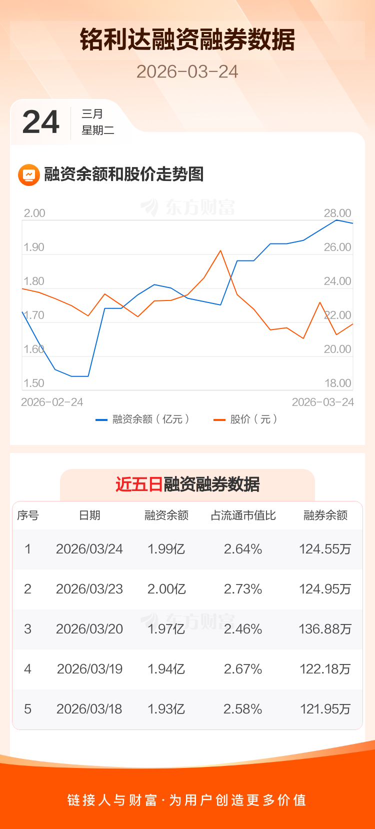交易所最新数据显示,铭利达于2026年3月24日获融资买入985.14万元,融资偿还1034.63万元,当日融资净偿还49.49万元。目前,该股融资余额1.99亿,占流通市值比例为2.64%。