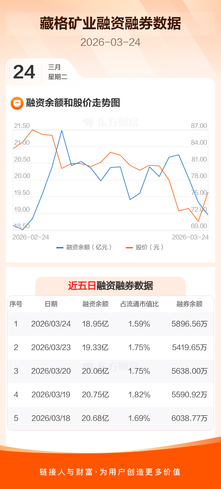 交易所最新数据显示,藏格矿业于2026年3月24日获融资买入1.75亿元,融资偿还2.13亿元,当日融资净偿还3814.74万元。目前,该股融资余额18.95亿,占流通市值比例为1.59%。