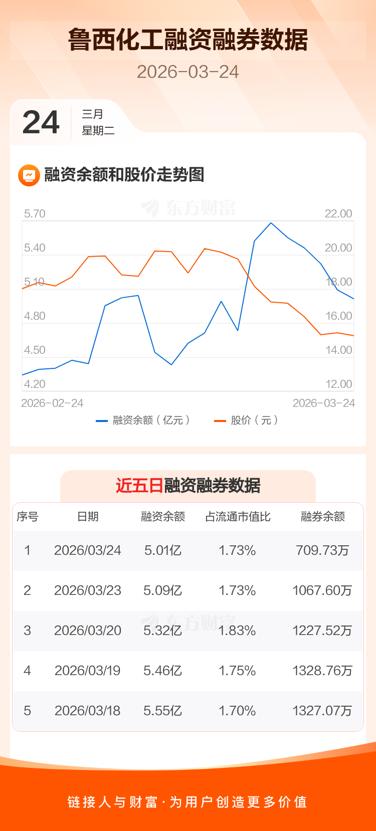 交易所最新数据显示,鲁西化工于2026年3月24日获融资买入3015.74万元,融资偿还3790.39万元,当日融资净偿还774.65万元。目前,该股融资余额5.01亿,占流通市值比例为1.73%。