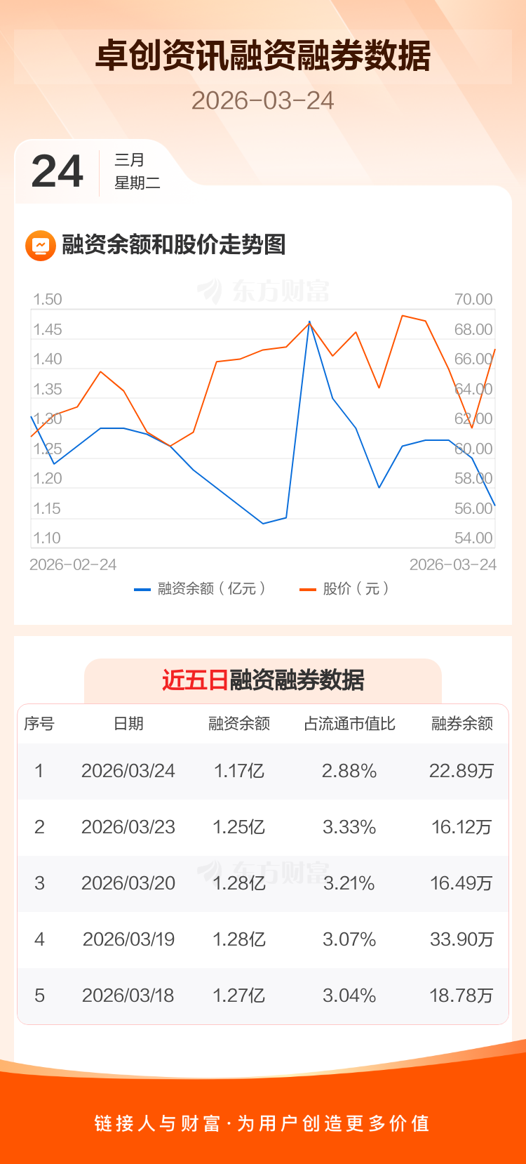 交易所最新数据显示,卓创资讯于2026年3月24日获融资买入995.13万元,融资偿还1729.27万元,当日融资净偿还734.14万元。目前,该股融资余额1.17亿,占流通市值比例为2.88%。