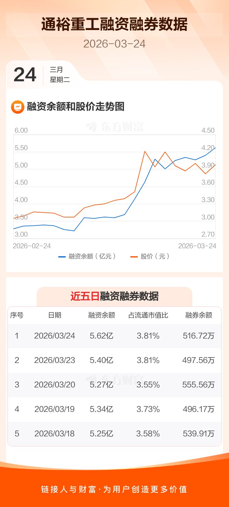 交易所最新数据显示,通裕重工于2026年3月24日获融资买入1.75亿元,融资偿还1.53亿元,当日融资净买入2214.32万元。目前,该股融资余额5.62亿,占流通市值比例为3.81%。