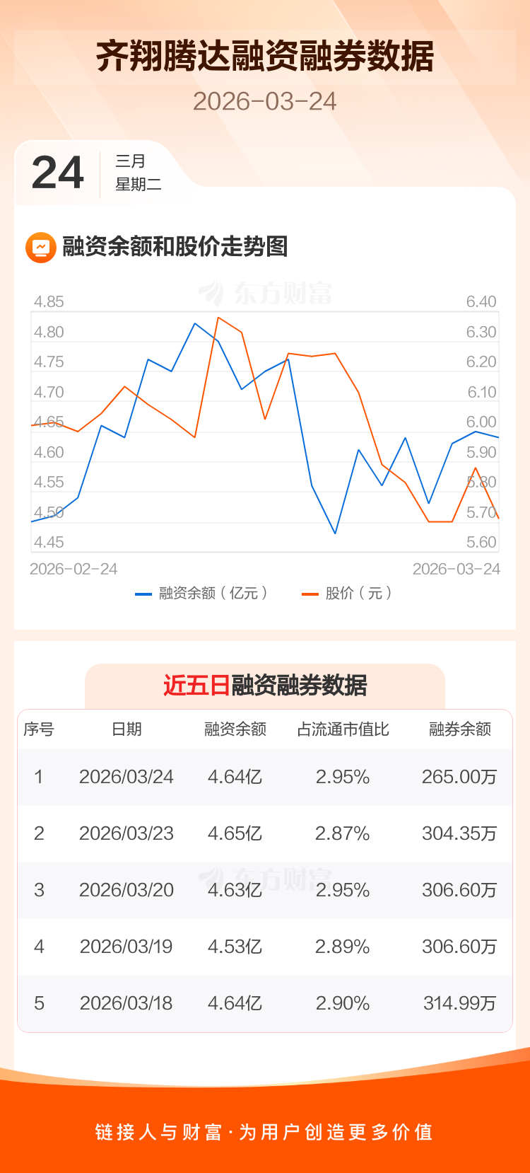 交易所最新数据显示,齐翔腾达于2026年3月24日获融资买入2635.06万元,融资偿还2766.23万元,当日融资净偿还131.17万元。目前,该股融资余额4.64亿,占流通市值比例为2.95%。