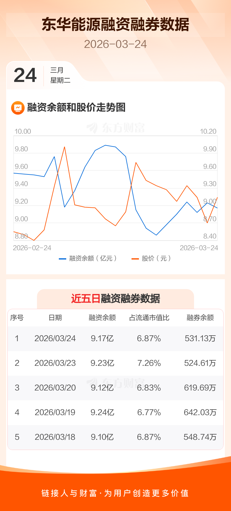 交易所最新数据显示,东华能源于2026年3月24日获融资买入3664.77万元,融资偿还4297.96万元,当日融资净偿还633.2万元。目前,该股融资余额9.17亿,占流通市值比例为6.87%。
