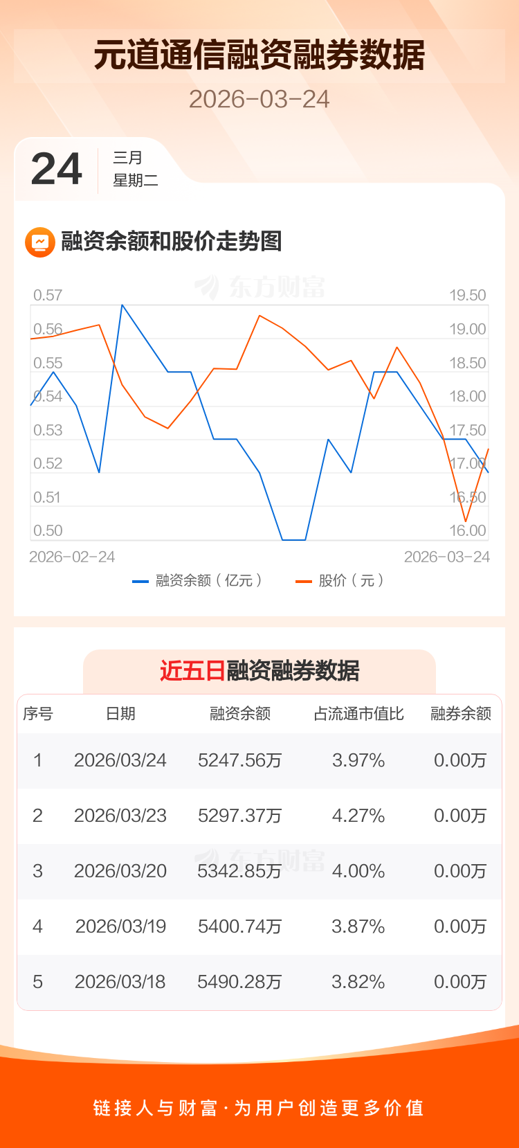 交易所最新数据显示,元道通信于2026年3月24日获融资买入499.27万元,融资偿还549.08万元,当日融资净偿还49.81万元。目前,该股融资余额5247.56万,占流通市值比例为3.97%。