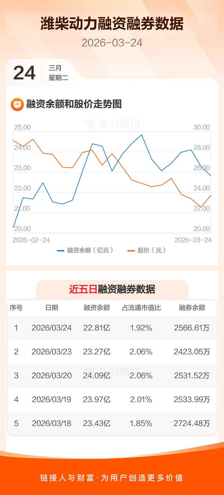 交易所最新数据显示,潍柴动力于2026年3月24日获融资买入1.75亿元,融资偿还2.21亿元,当日融资净偿还4607.73万元。目前,该股融资余额22.81亿,占流通市值比例为1.92%。