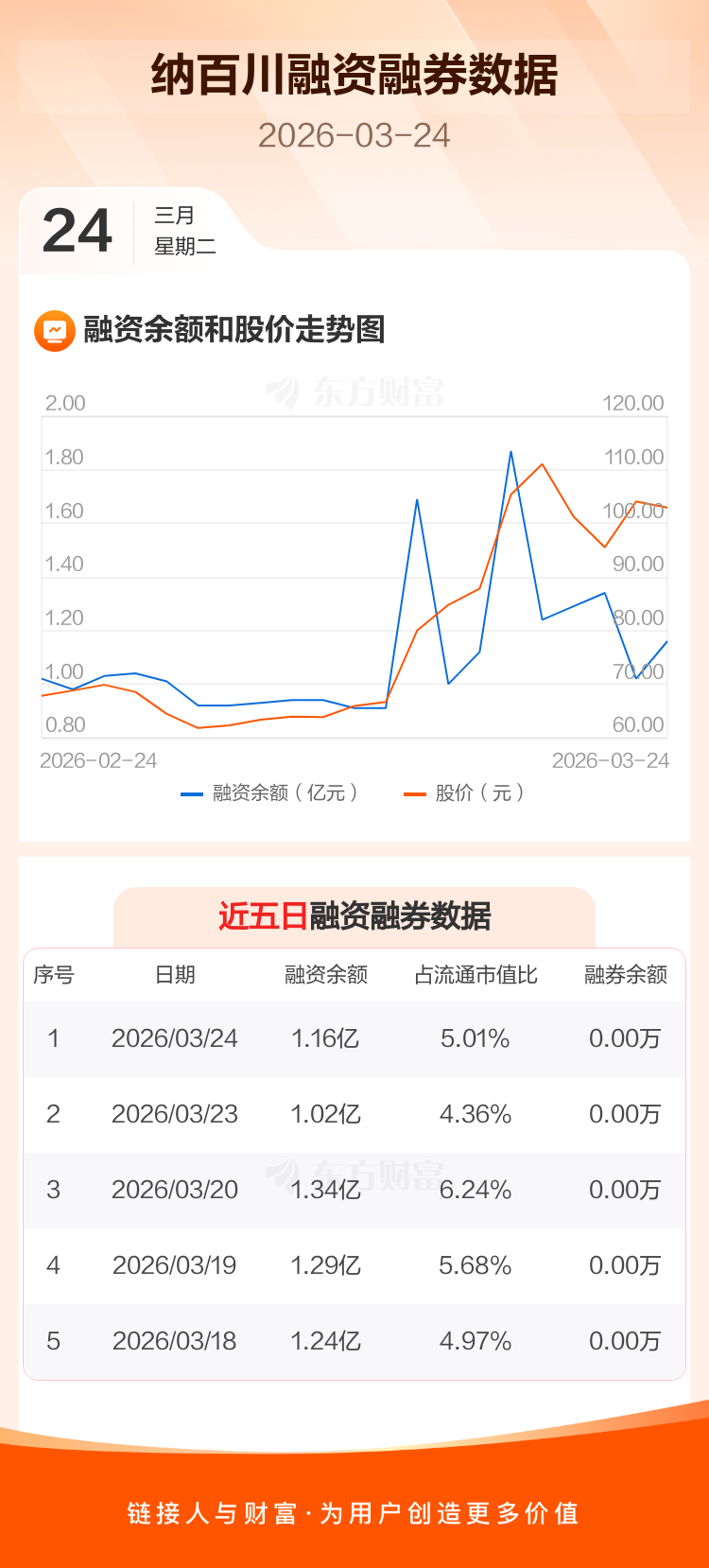 交易所最新数据显示,纳百川于2026年3月24日获融资买入6806.52万元,融资偿还5406.36万元,当日融资净买入1400.15万元。目前,该股融资余额1.16亿,占流通市值比例为5.01%。