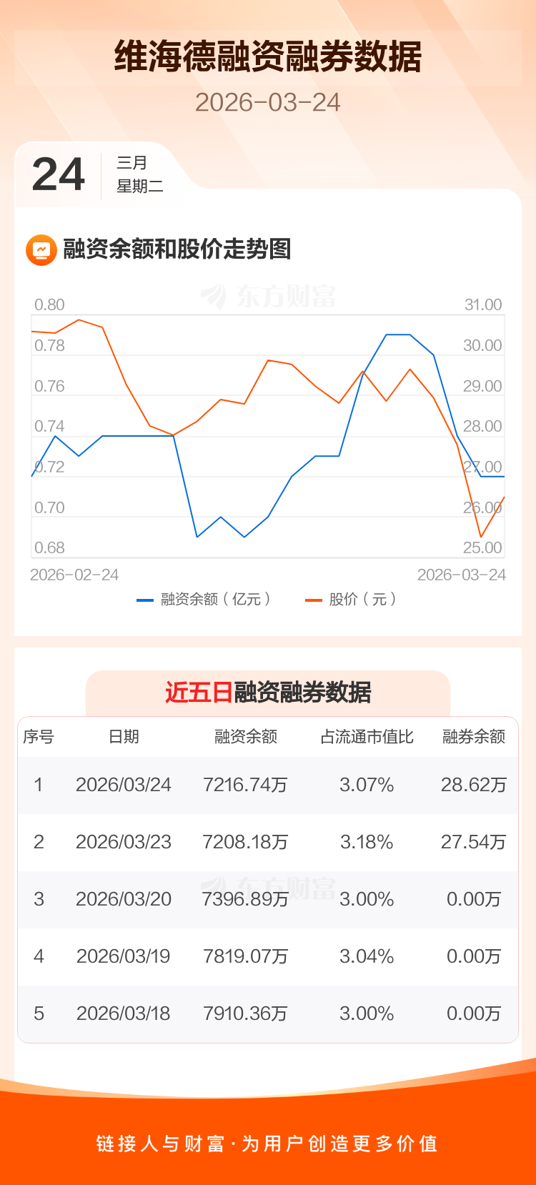 交易所最新数据显示,维海德于2026年3月24日获融资买入352.10万元,融资偿还343.54万元,当日融资净买入8.56万元。目前,该股融资余额7216.74万,占流通市值比例为3.07%。