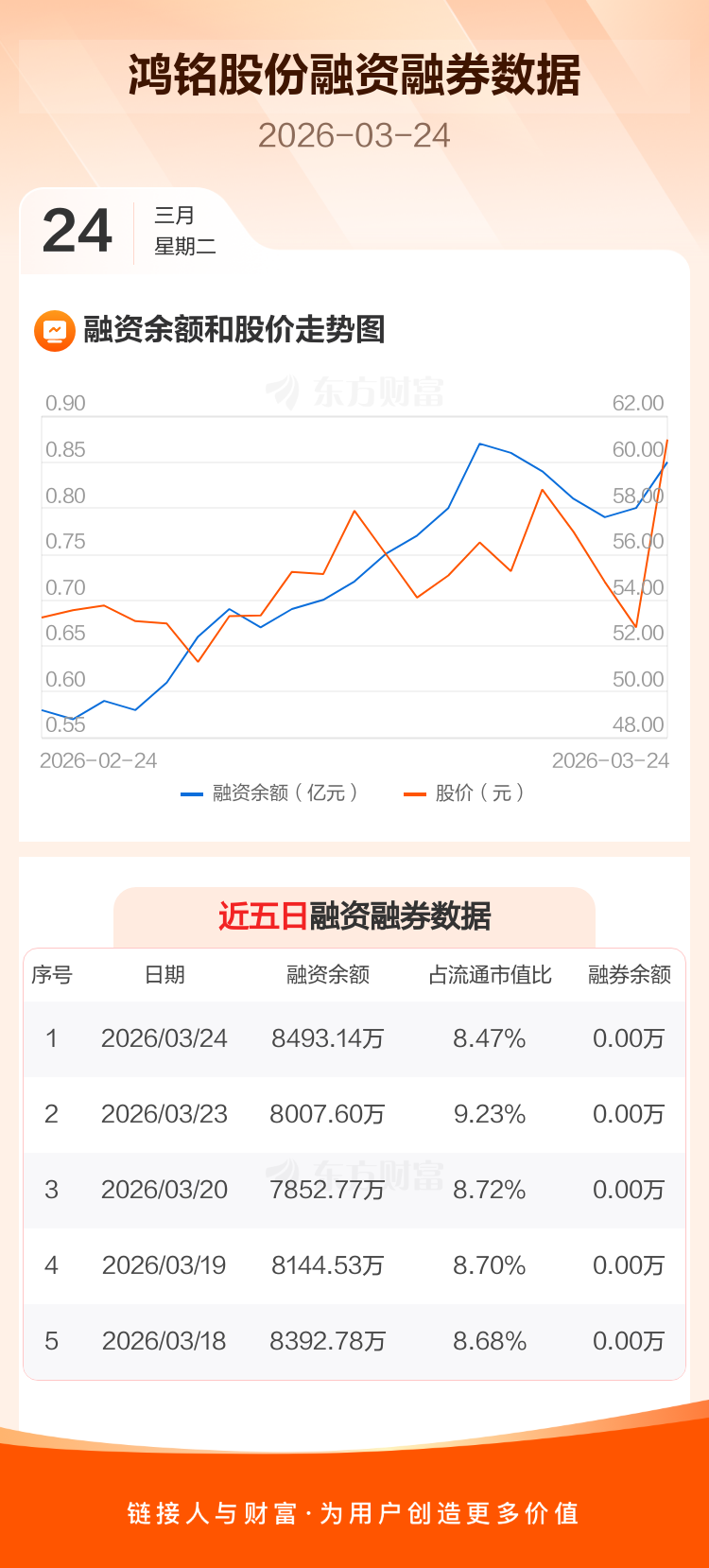 交易所最新数据显示,鸿铭股份于2026年3月24日获融资买入1692.86万元,融资偿还1207.32万元,当日融资净买入485.54万元。目前,该股融资余额8493.14万,占流通市值比例为8.47%。