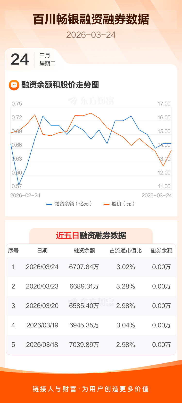 交易所最新数据显示,百川畅银于2026年3月24日获融资买入791.59万元,融资偿还773.05万元,当日融资净买入18.53万元。目前,该股融资余额6707.84万,占流通市值比例为3.02%。