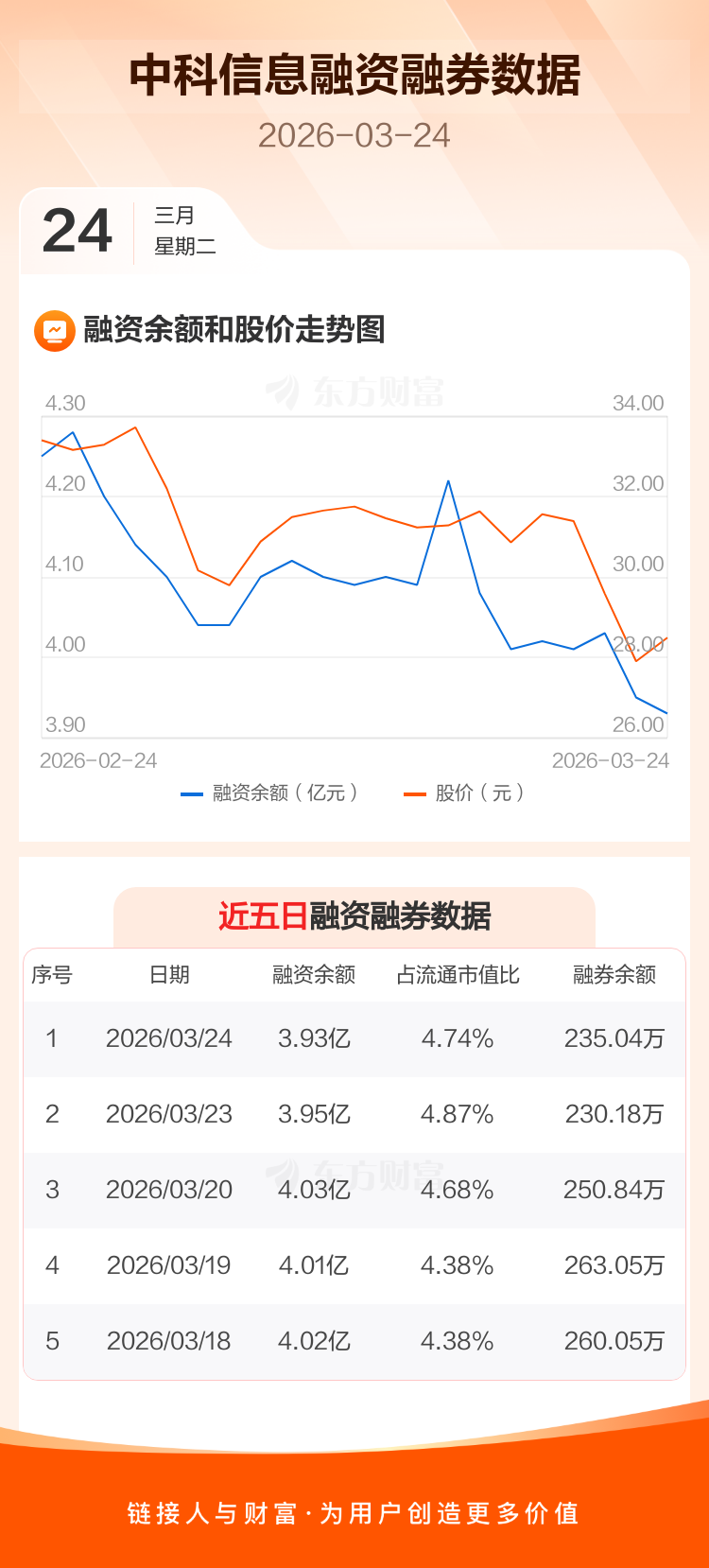 交易所最新数据显示,中科信息于2026年3月24日获融资买入1015.73万元,融资偿还1245.24万元,当日融资净偿还229.51万元。目前,该股融资余额3.93亿,占流通市值比例为4.74%。